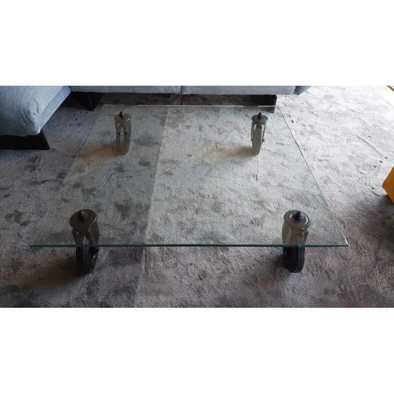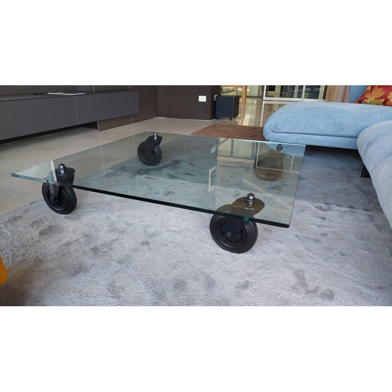 Tavolo con ruote è l'iconico progetto firmato da Gae Aulenti per FontanaArte nel 1980 costituito da una lastra spessa in vetro molato come piano e rotelle industriali come base. Proposto a prezzo outlet per rinnovo expo: