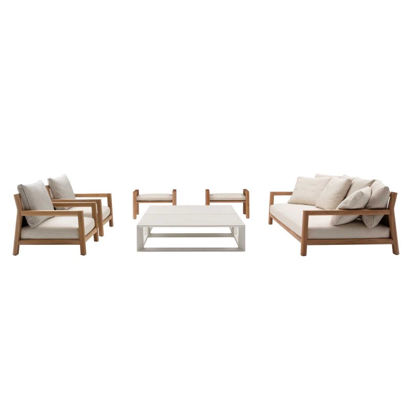 Pablo è la prima collezione outdoor di Vincent Van Duysen per B&B Italia. Un progetto dalle geometrie proporzionate, declinato in una poltrona in due profondità, divano, poggiapiedi e tavolino. Votato al minimalismo e alla nobiltà dei materiali, Pablo è caratterizzato dalla struttura in teak, noto per le proprie performance tecniche e resistenza alle intemperie. Pablo è un perfetto equilibrio tra ricerca stilistica e funzionalità: la struttura non ha interruzioni favorendo la manutenzione del legno, così come i pannelli posteriori in tessuto, facilmente rimovibili per facilitarne il mantenimento. Accorgimenti che rendono Pablo una collezione in apparenza semplice, ma ricca di dettagli da apprezzare.