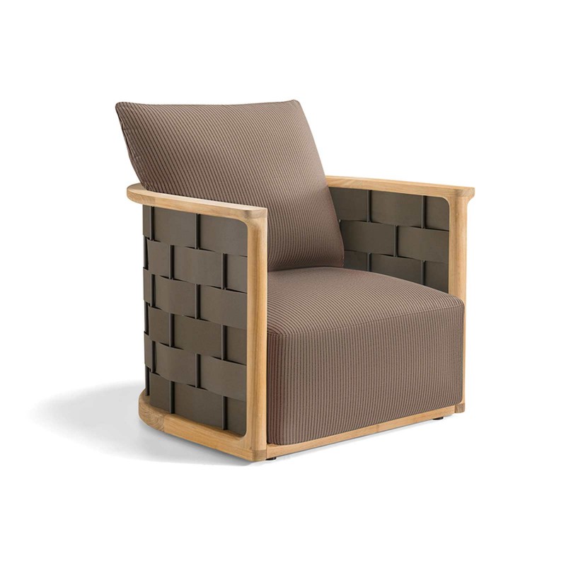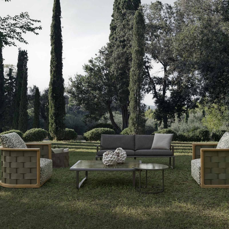 Palinfrasca è la serie di imbottiti firmata da Vincent Van Duysen per la prima collezione outdoor di Molteni&C. Dall'estetica moderna ma rassicurante, Palinfrasca è connotata da una struttura curvata in massello di teak impreziosita da un motivo intrecciato trama ordito ingigantito, disponibile in teak o poliuretano EVA verde oliva.