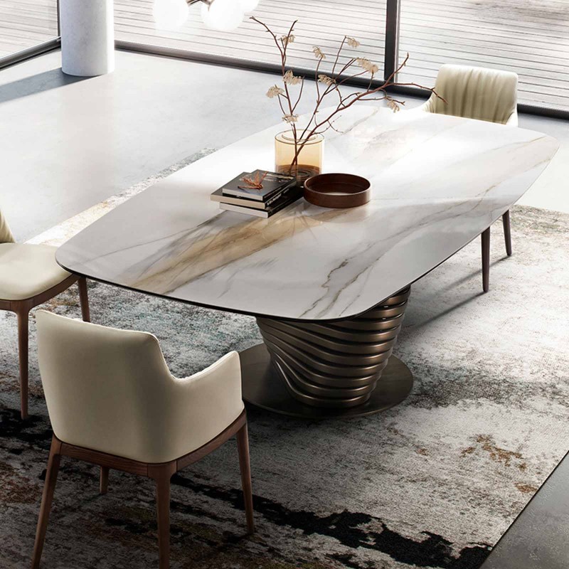 Rotolo è il tavolo di Eforma che spicca per la base dalla forma a spirale in metallo verniciato. Rotondo, rettangolare o sagomato, questo tavolo arreda con gusto e stile contemporaneo la zona giorno. Il piano spessore 16 mm è in ceramica effetto marmo 6 mm accoppiato con un vetro temperato 10 mm. Disponibile anche nella versione allungabile.