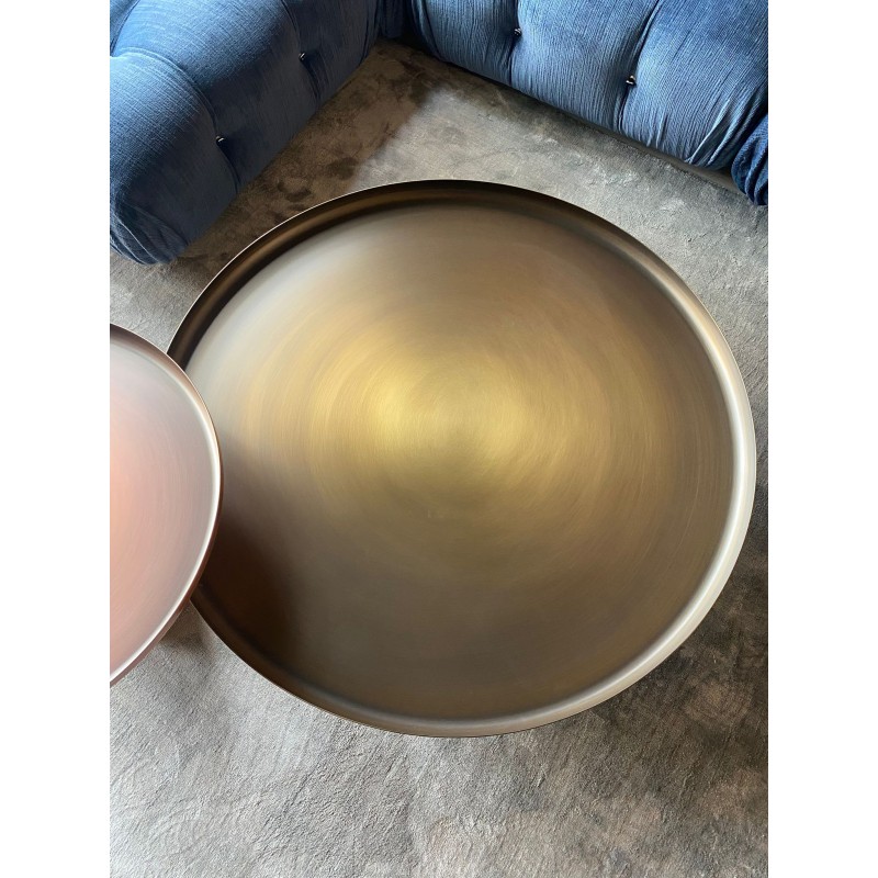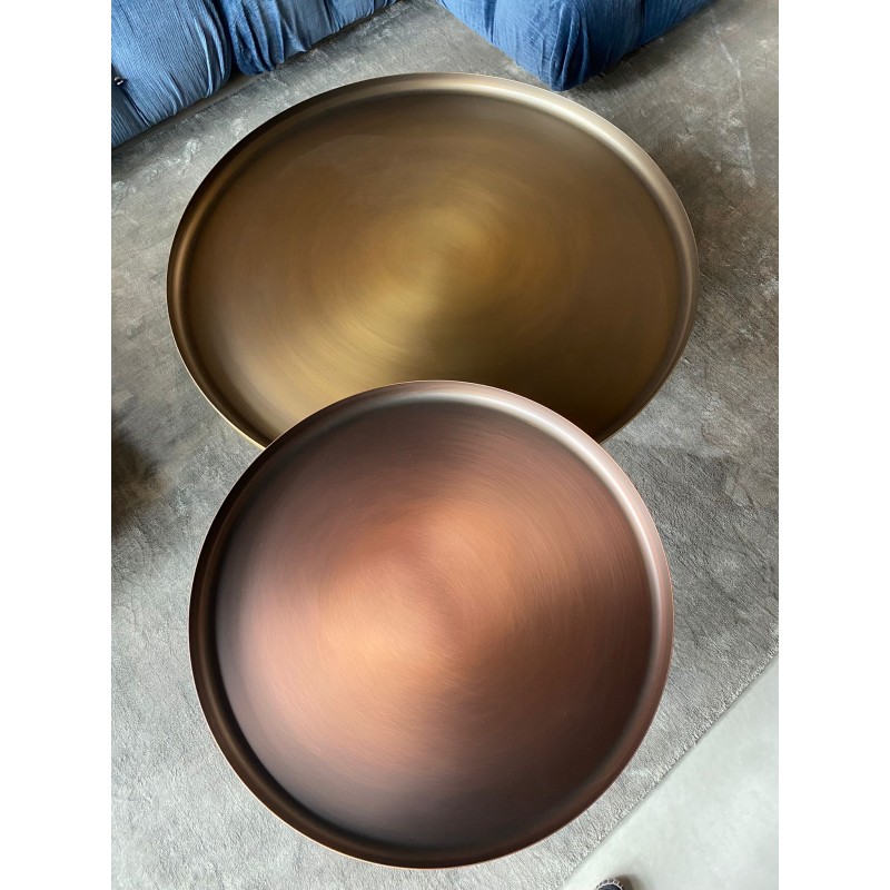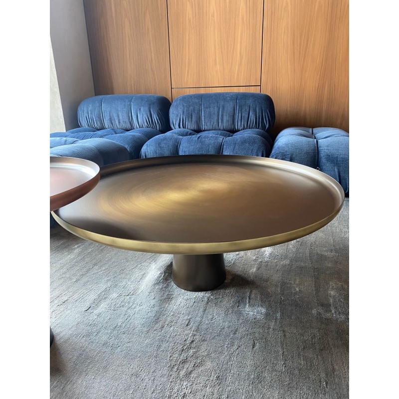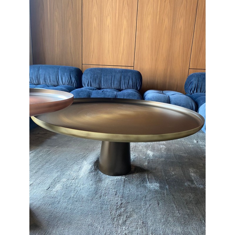 Il tavolino Sunrise di De Castelli si caratterizza per il piano circolare dove il metallo, materiale d'elezione del brand, si esprime in tutta la sua purezza e lavorazione manuale e ossidazione, con sfumatura ellittica verso il centro. Il piano è a contrasto con il ferro DeLabré della base.
