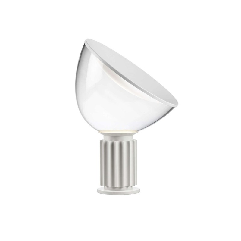 La lampada Taccia Small di Flos è un'icona indiscussa del design, firmata da Achille e Piergiacomo Castiglioni. Considerata dai designer la "Mercedes delle lampade", Taccia ha sembianze tradizionali nella base realizzata in alluminio verniciato nero, che ricorda una colonna classica. Il diffusore è una campana di vetro profonda sulla sommità della quale alloggia un disco concavo in alluminio smaltato bianco.