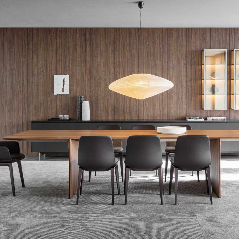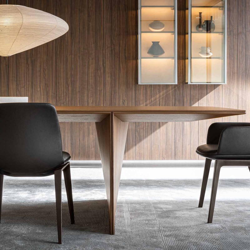 Il tavolo Ava di Molteni&C design by Foster + Partners è un tavolo da pranzo concepito interamente in essenza. Un complemento per l'area living dal sofisticato effetto materico del legno, impiegato con parsimonia per realizzare una soluzione modulare sostenibile. La sostenibilità è, d'altronde, la visione che guida lo studio, volto a soddisfare le esigenze di chi vive la casa con un'attenzione all'ambiente. Ava si ispira alle opere di edilizia e di ingegneria, traendo spunto dalle forme leggere delle ali degli aerei e dei ponti. Il tavolo è composto da due segmenti principali: una sezione centrale e un'estremità. Scultoreo e minimale al contempo, Ava di Molteni&C prevede le giunzioni tra le due sezioni accentuate da una fuga d'ombra che ricorda le tradizioni architettoniche.