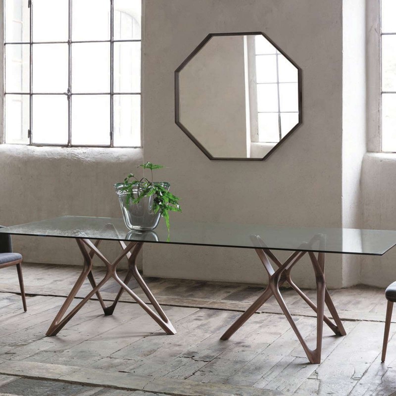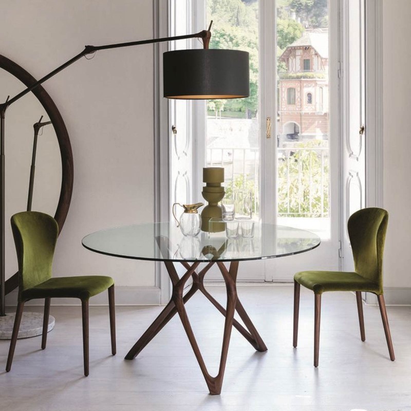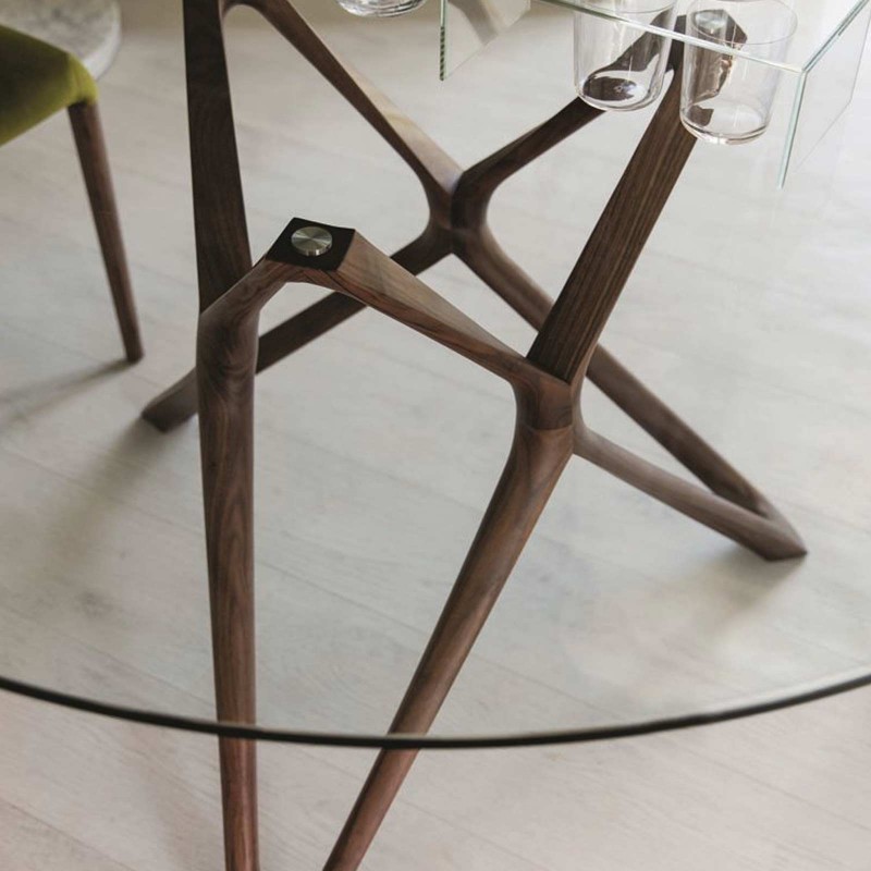 Circe di Porada è un tavolo da pranzo disponibile nel formato rotondo o rettangolare in cristallo. A sostenere il piano con spessore 12 mm è una serie di rombi in massello di noce canaletta che restituiscono al tavolo un sobrio motivo geometrico. Il risultato è una discreta soluzione per la zona giorno, che esprime il know how di Porada nella lavorazione di materiali nobili.