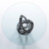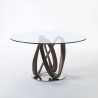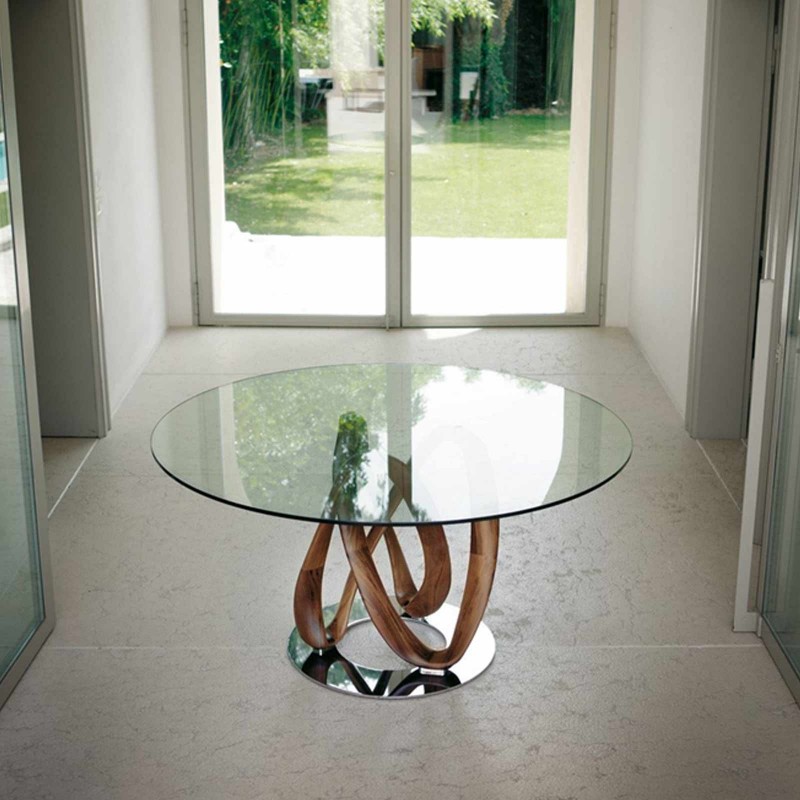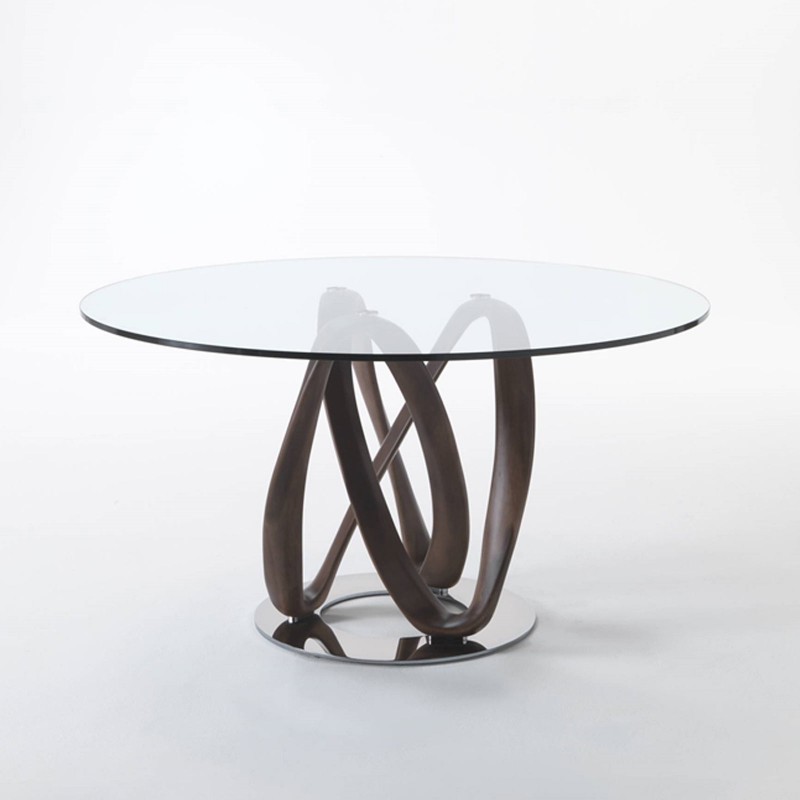 Infinity di Porada è un tavolo da pranzo con base in massello di noce canaletta montata su una piastra in metallo e piano in cristallo temperato (spessore mm. 12). Un monumentale complemento dove la particolarità è tutta nello scenografico groviglio di elementi in legno lavorato, espressione dell'eccellente manifattura del brand italiano, che sembrano radici secolari che sorreggono un sottile disco in vetro.