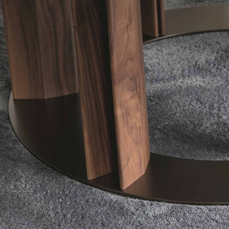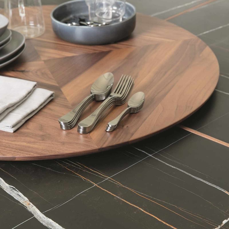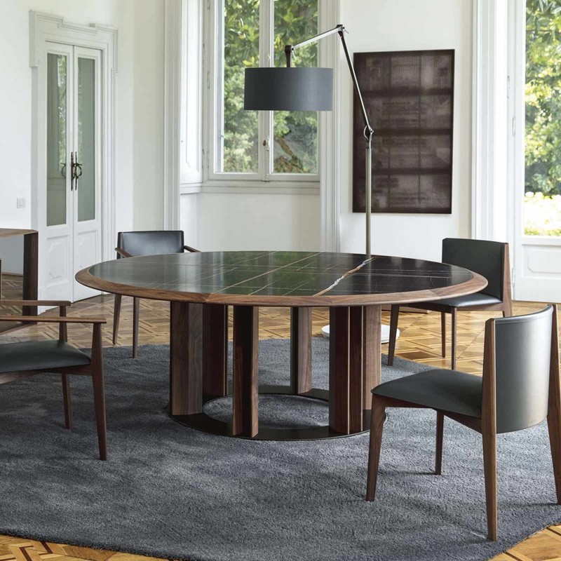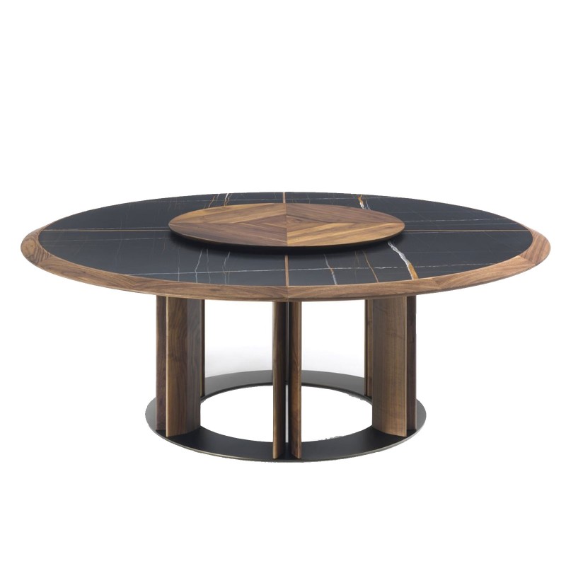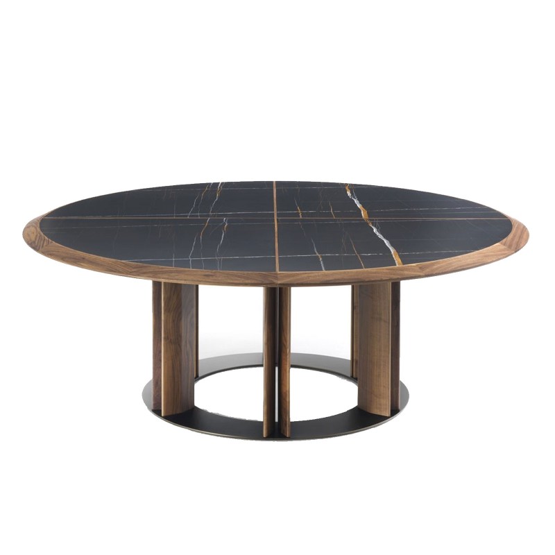Elogio all'eleganza attraverso la combinazione di tre materiali: massello di noce canaletto, marmo e bronzoro. Thayl è il tavolo di Porada con il piano suddiviso in quattro sezioni. Rotondo, è disponibile in varie dimensioni. Armonia delle forme e design contemporaneo per arredare con carattere le zone giorno e gli spazi per la collettività.